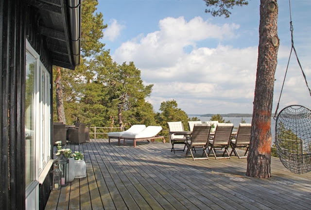 Espacios acogedores en colores suaves que armonizan con las paredes y suelos de madera blanca y con algunos toques de color, una casa renovada recientemente y rodeada de una amplia terraza de madera con unas magnificas vistas, un lugar perfecto para el descanso veraniego.