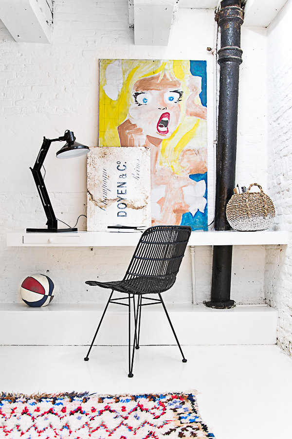 Not sure where to start - the exposed brick wall painted white? The fab throw and rugs? The vintage bar stools? The wooden stool with the orange seat?! What about you?